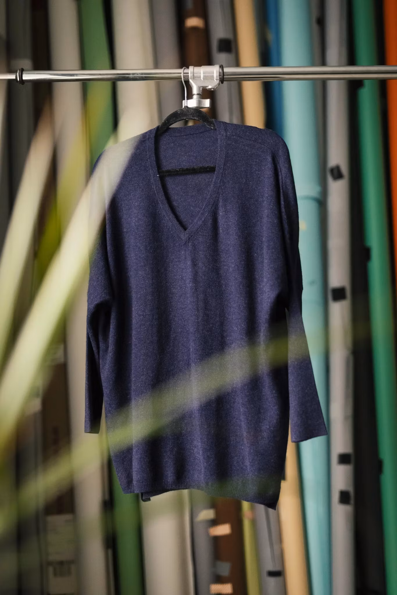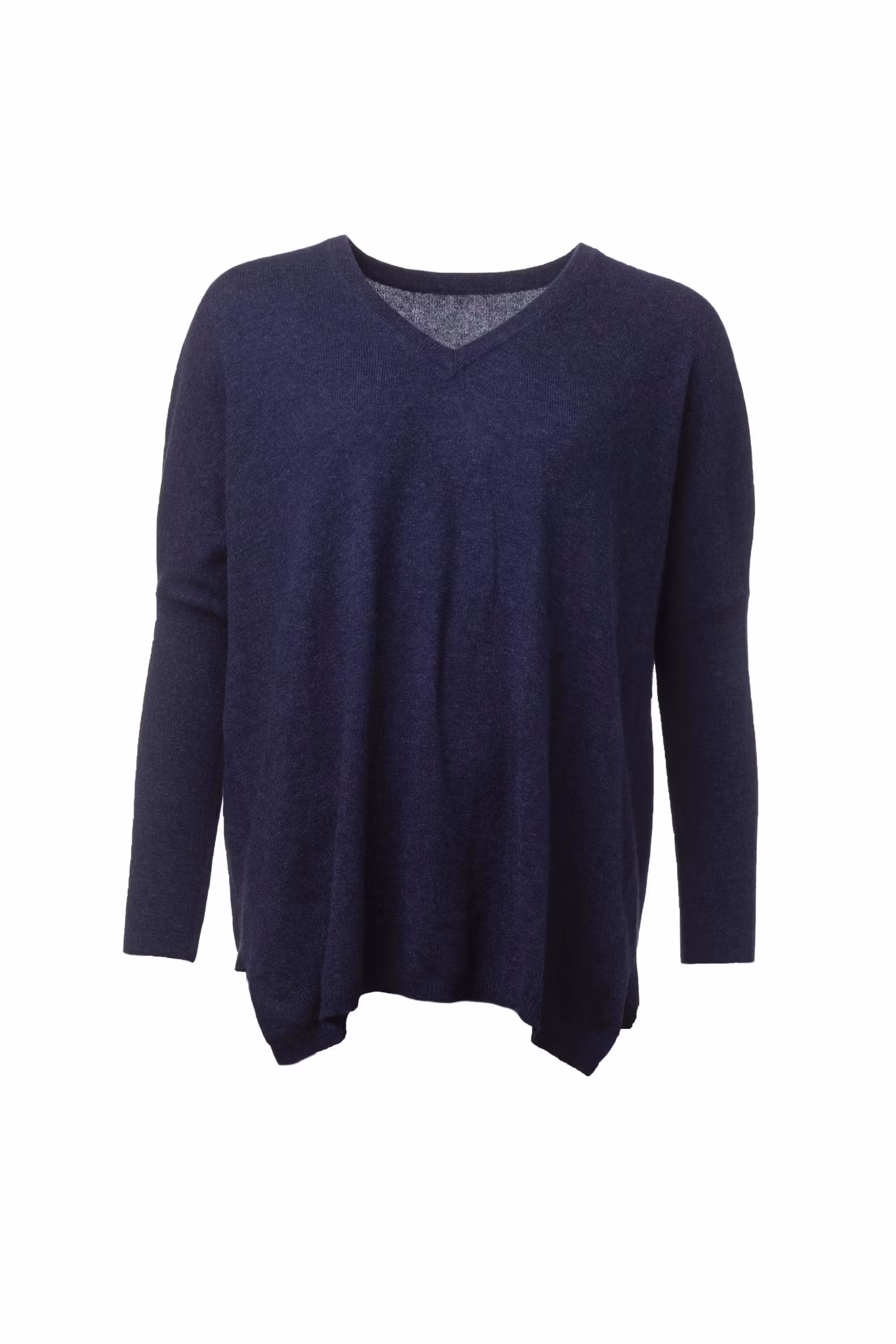 En modern kashmirtröja i 100% kashmir med en fin v-ringning, oversize passform och en smalare ribbad ärm.