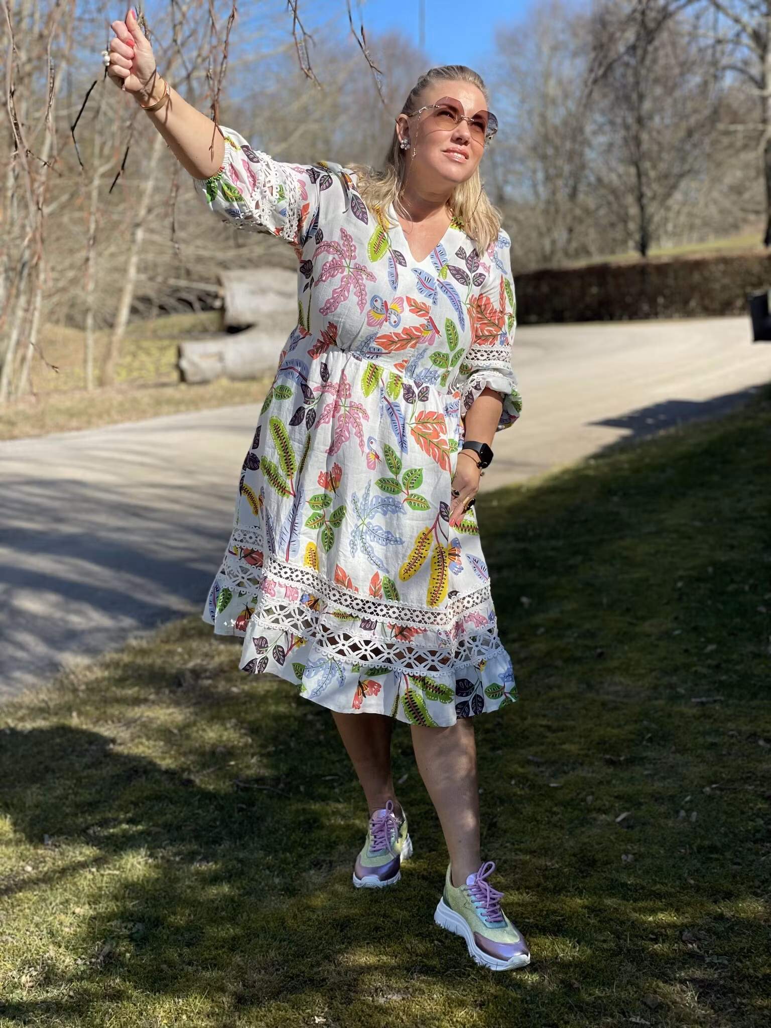 I lager. ANGOOR Klänning " Gerry " , multicolor 2 499 kr storlek 34 36 38 40 42 44 46 Lägg i varukorgen Superfin V-ringad linneklänning med 3/4 ärm. Virkad spets i ärmen och nertill. Dragkedja i ryggen. Färg : Multicolor Material : 100 % Linne Tvättråd : 30°