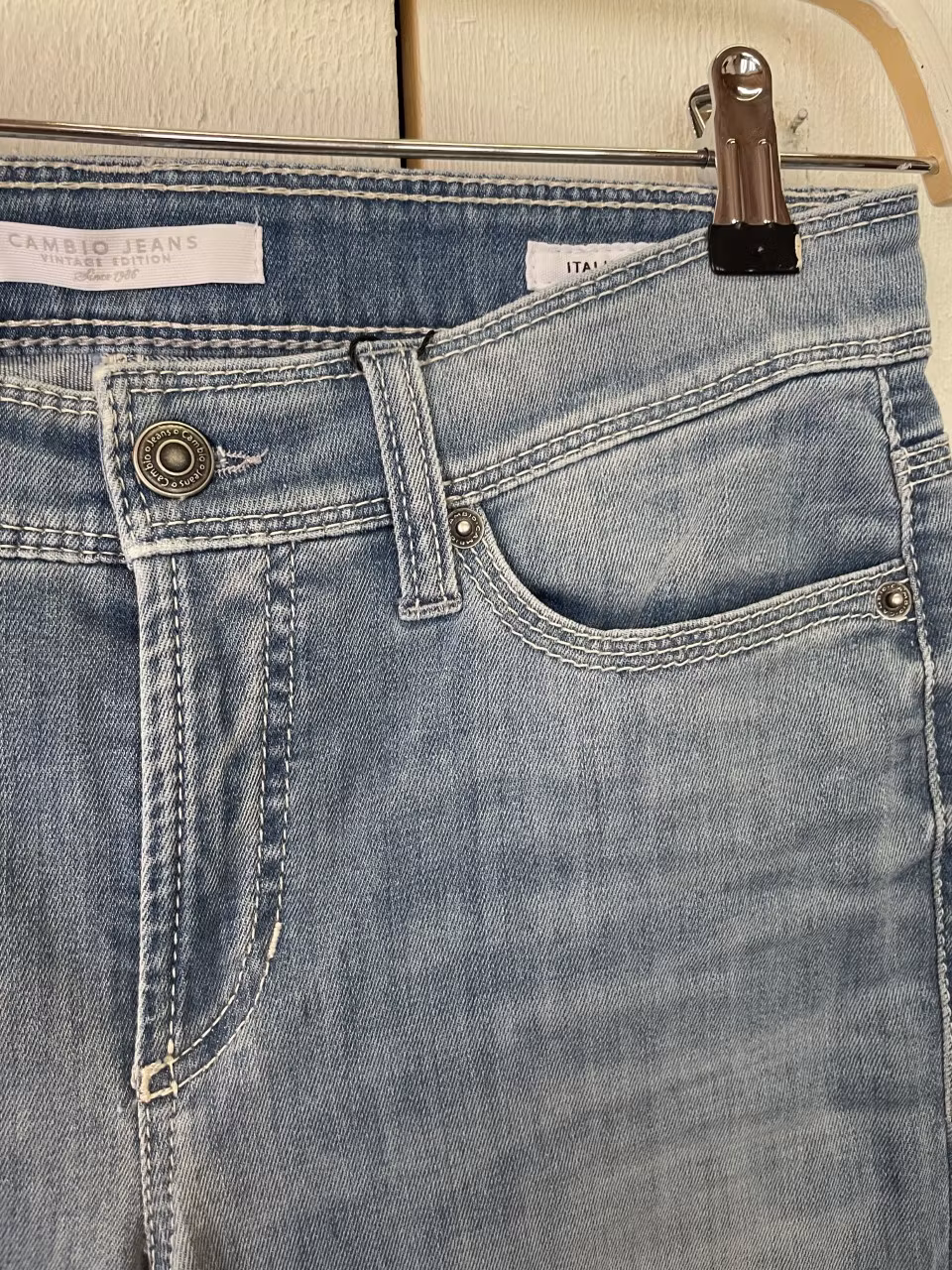 I lager. Cambio jeans "Piper Short" , ljusblå tunn 1 699 kr storlek 34 36 38 40 42 44 46 Lägg i varukorgen Cambio jeans " Piper " short beige. Beninnerlängd : 69cm i stl 38Färg : ljusblå Material : 92 % bomull , 6 % Elastomultiester, 2 % elastan Tvättråd : 30 °