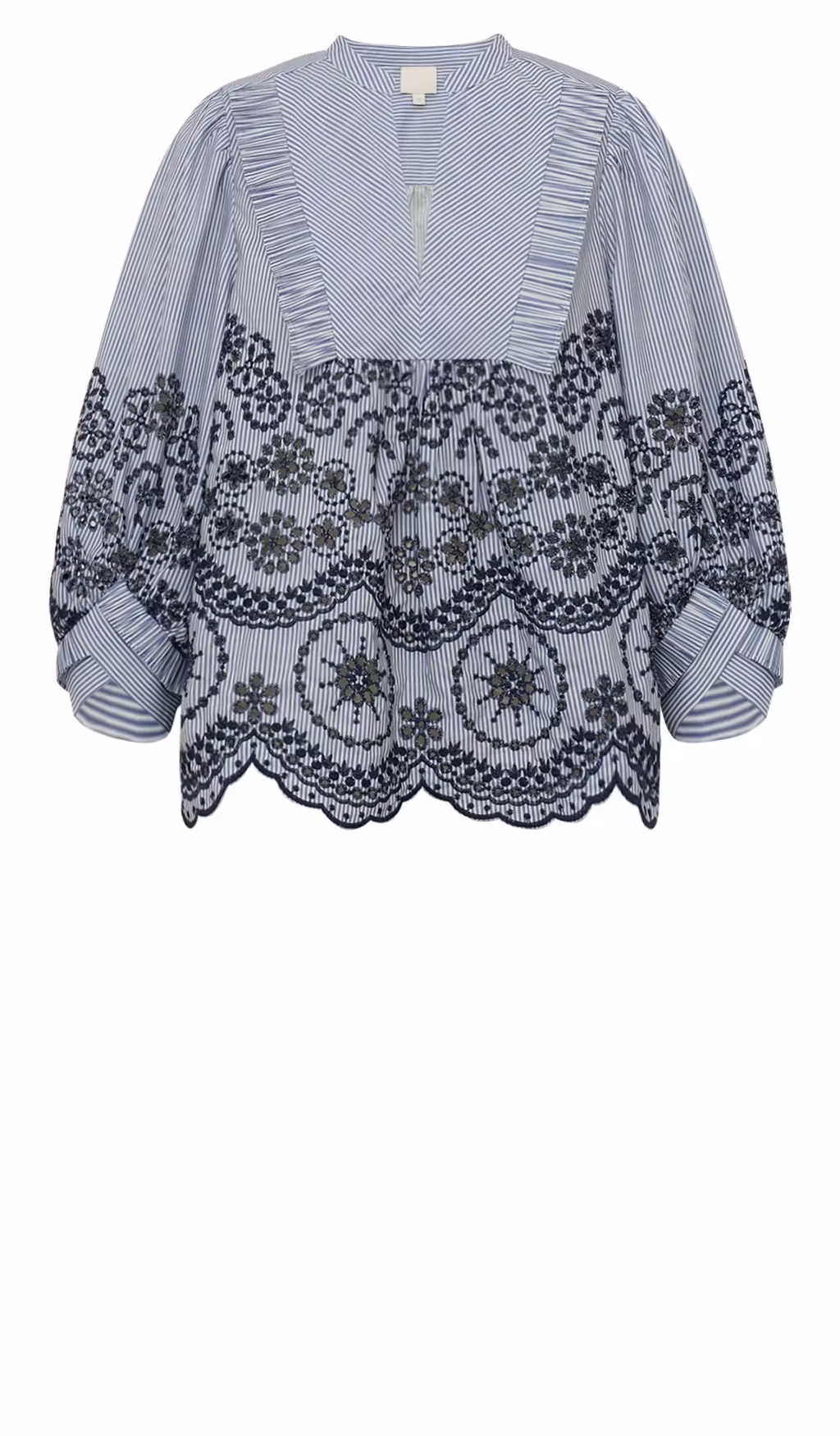 Vacker randig skjortblus med ett fantastiskt helbroderat mönster som ger ett feminint och exklusivt uttryck. Den fina volangdetaljen fram framhäver den eleganta designen, medan den enkla kragen och den djupa V-ringningen skapar ett lätt och modernt utseende. En stilfull blus som fungerar både till vardags och vid särskilda tillfällen. Snygg detalj i tyget vid ärmslut.