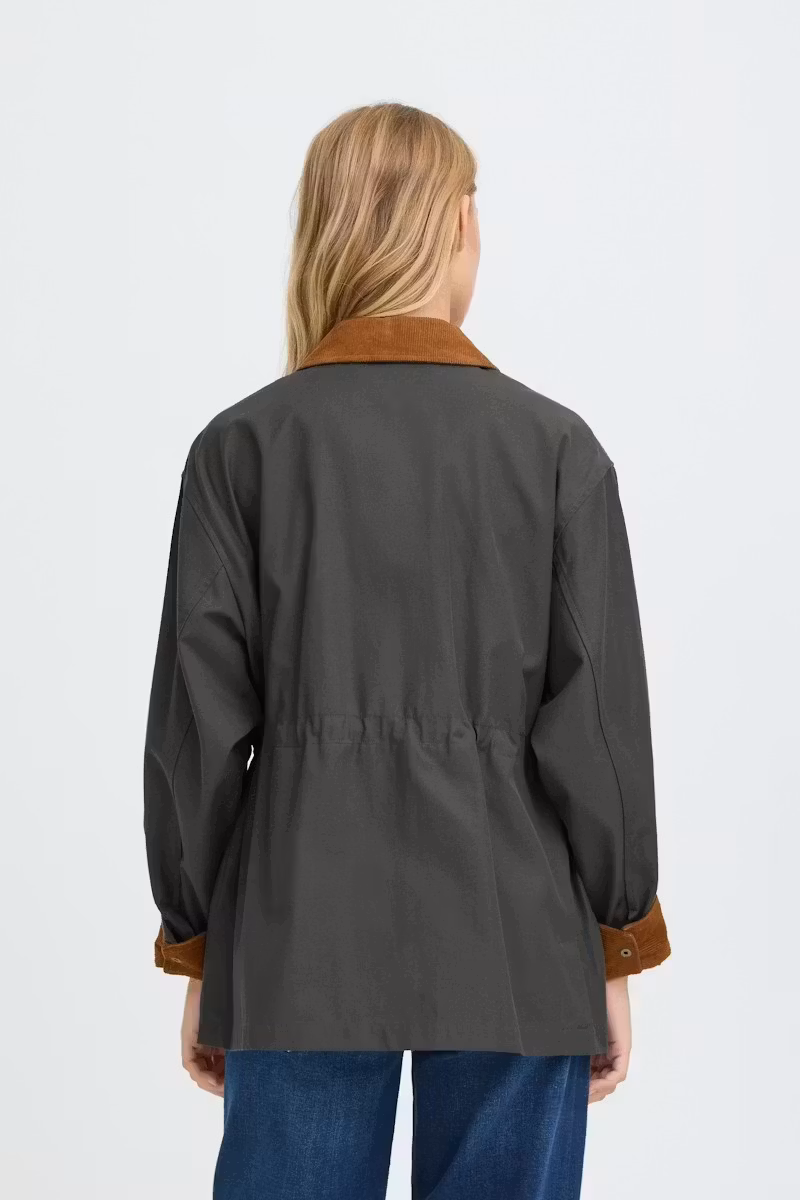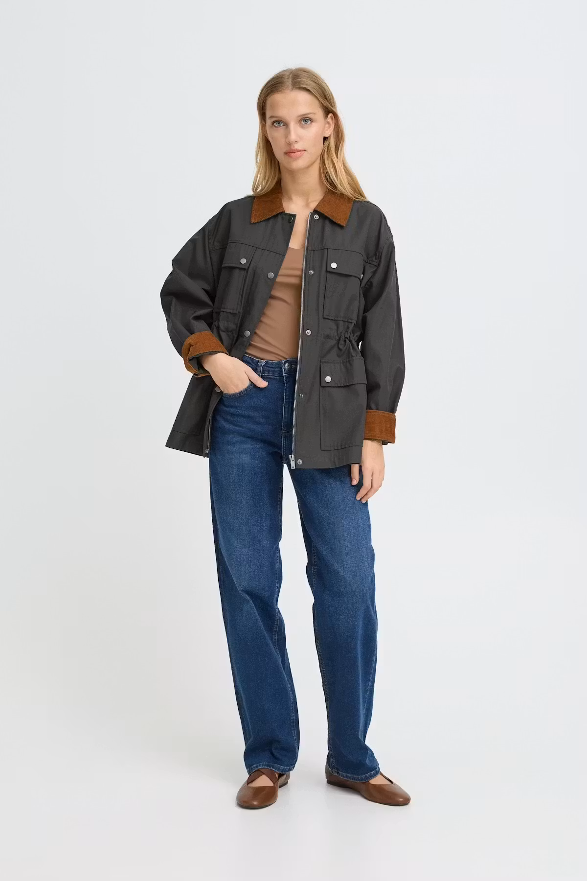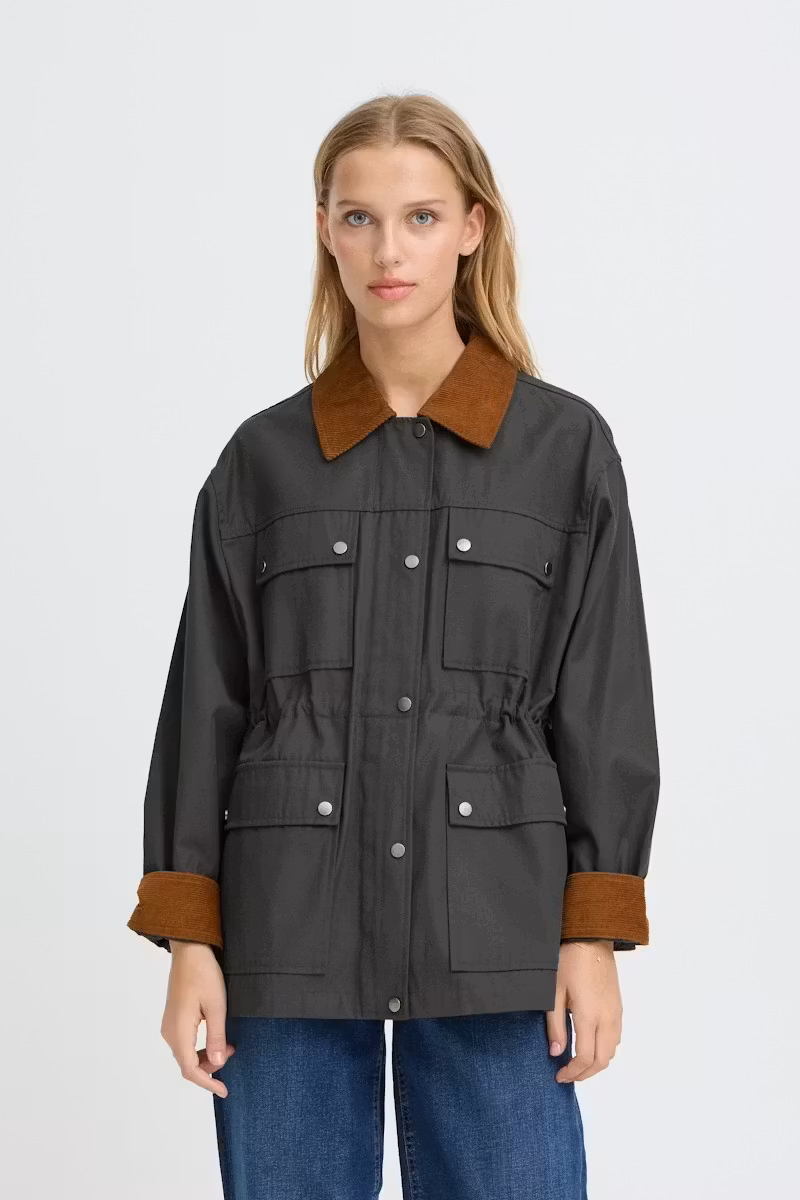 I lager. ICHI " IHEDIMO" Jacka , raven 1 399 kr storlek 38 40 42 44 Lägg i varukorgen Snygg " funktionsjacka" med avslappnad passform, bred manchesterkrage. Tryckknappsstängning och justerbar midja. Fyra praktiska fickor med lock och tydliga sömmar.Färg : Raven ( Grå/grön) Material : 56% Bomull, 44% PolyesterTvättråd : 40°