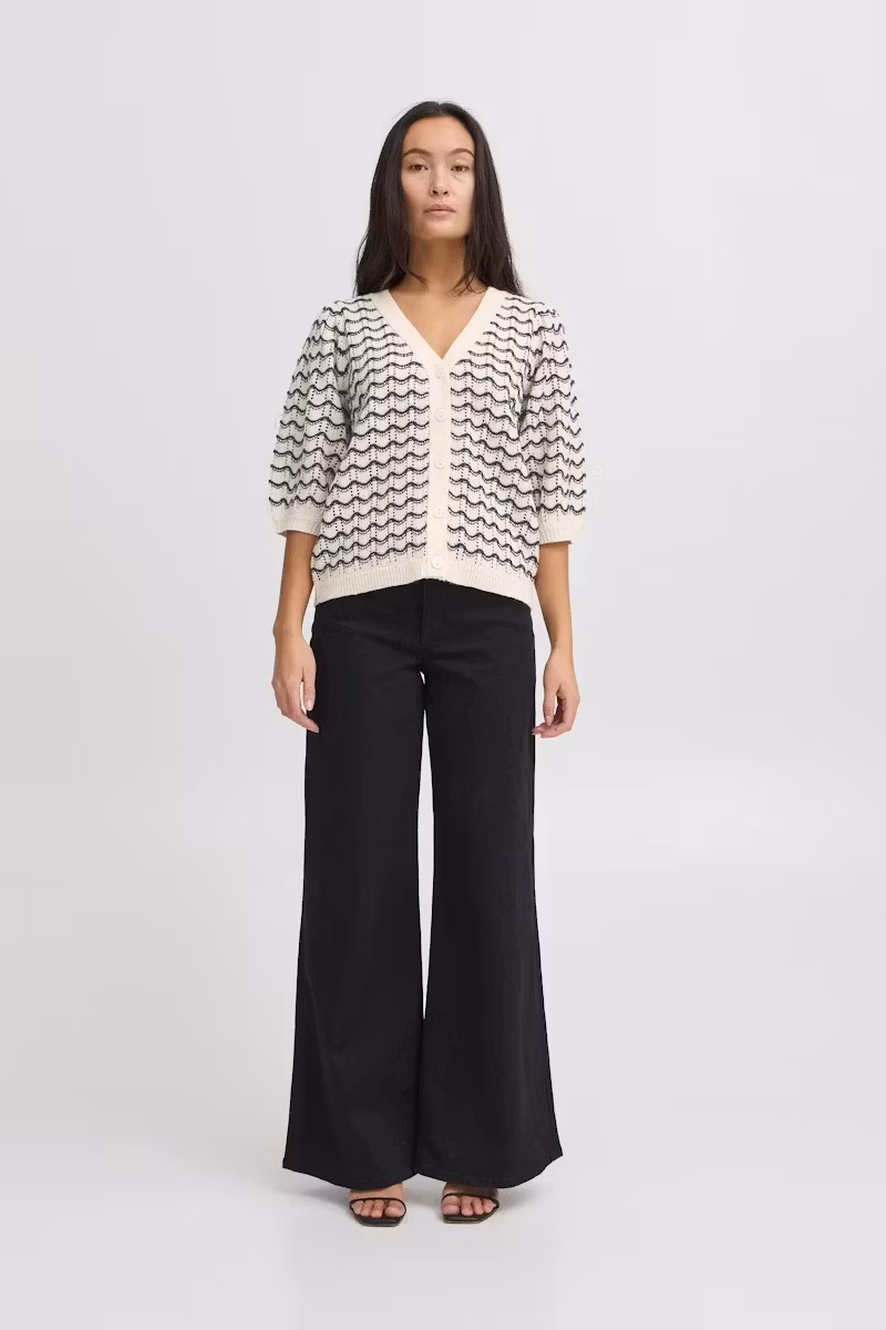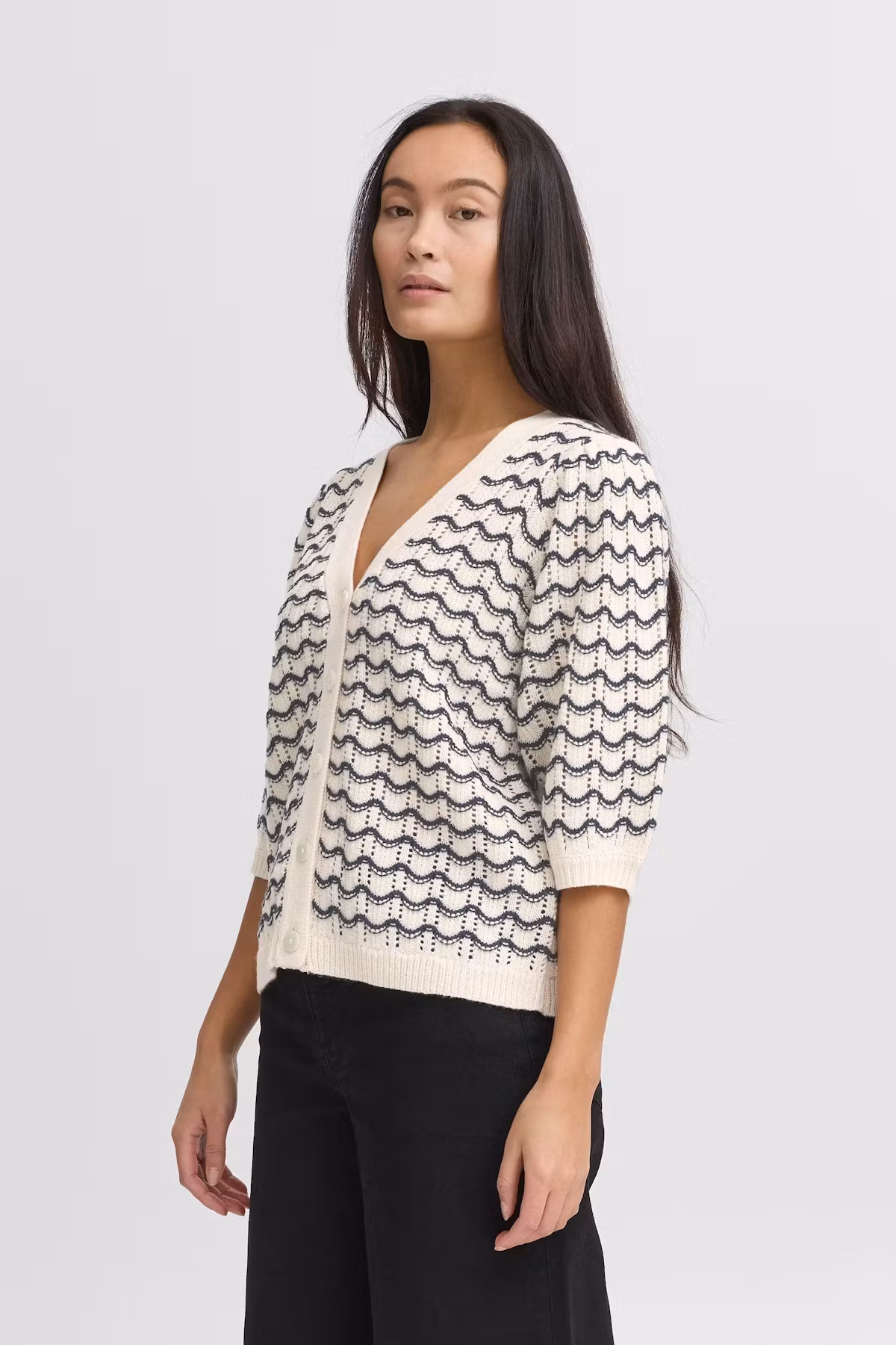 I lager. ICHI stickad cardigan "ARDINA" , creme/marin 599 kr 359 kr storlek XS S M L XL XXL Lägg i varukorgen Kortärmad , stickad cardigan i lös passform. 3/4 ärm med lite puffkänsla då det är en liten mudd i ärmslutet. Kan användas både öppen och stängd. Färg : Creme , Marin Material : 100 % Akryl Tvättråd : 30°
