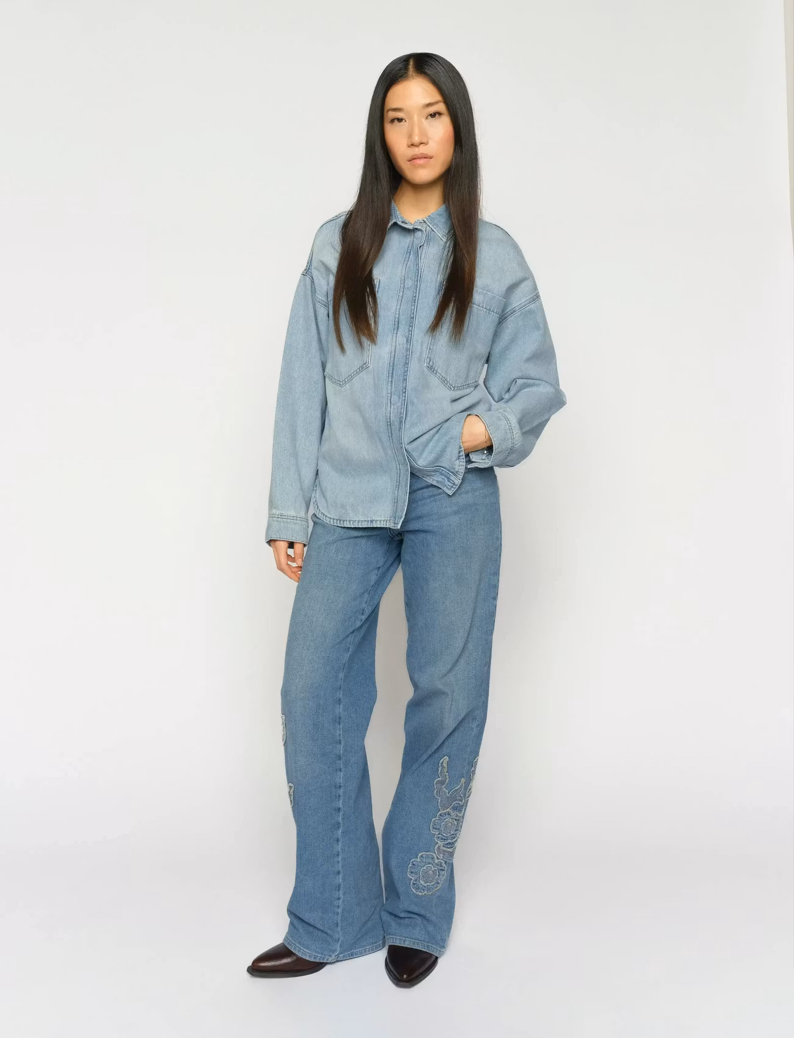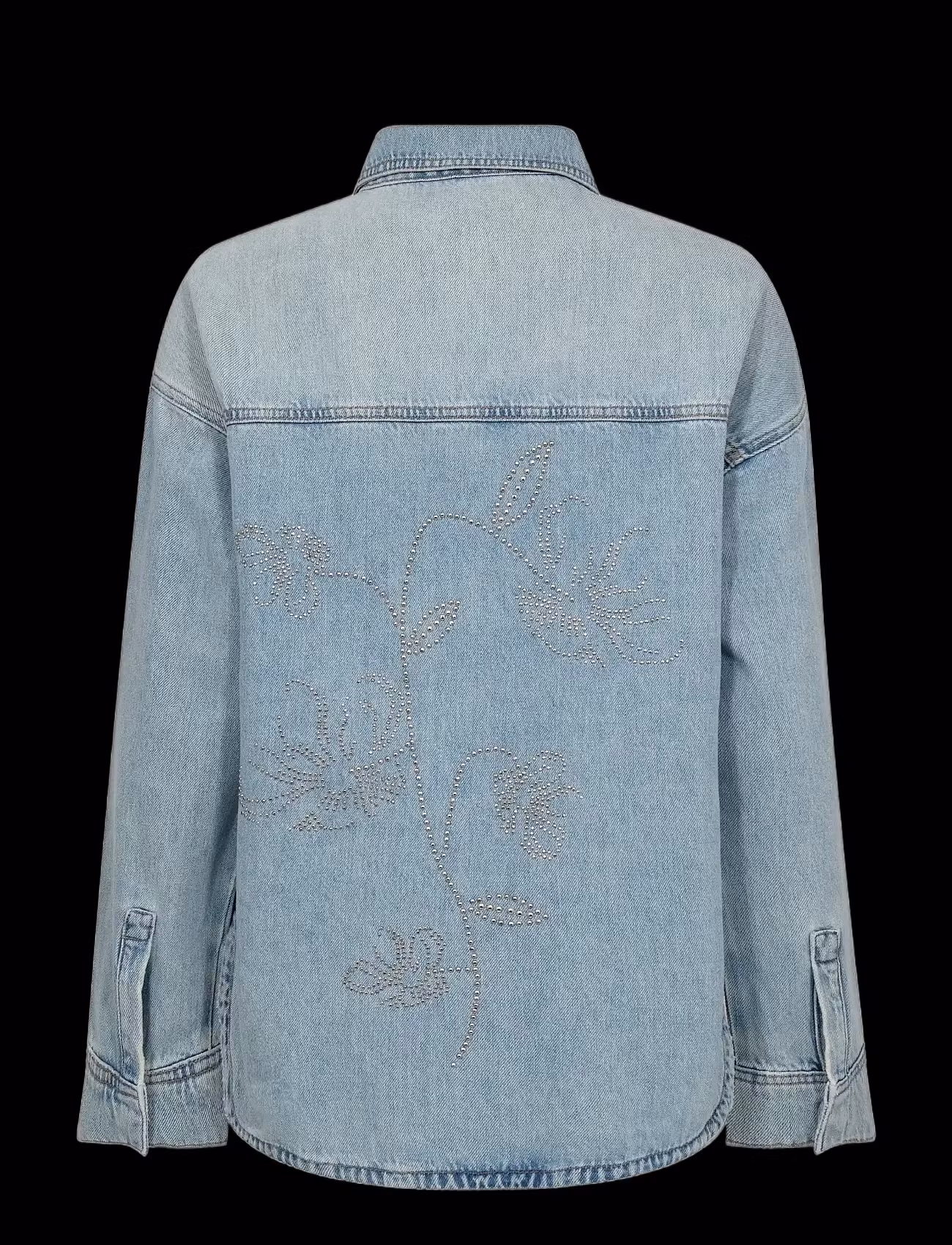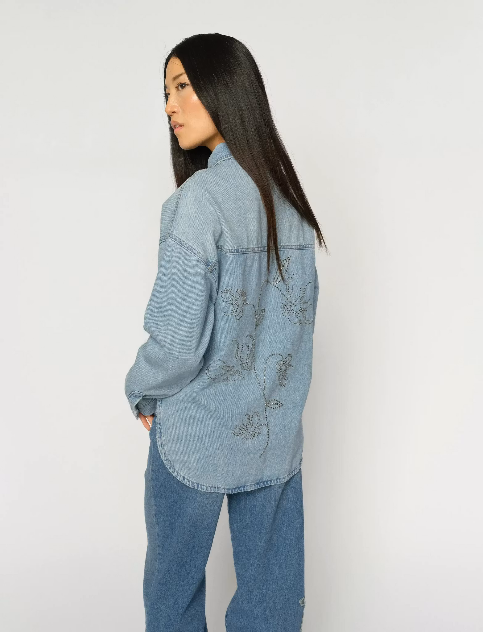 Denna skjorta är tillverkad i en klassisk denimstil och har en knäppning framtill och bröstfickor, vilket ger en blandning av funktionalitet och stil. Den avslappnade passformen gör den idealisk för lager-på-lager eller för att bäras som den är. Nitar på ryggen formade till blommor.