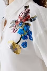 I lager. Oui Blus " paljett blomma " , optic white 1 550 kr storlek 36 38 40 42 Lägg i varukorgen Krispig vit skjorta med dekorativa paljettblommor framtill. Lång ärm och kortare i modellen. Färg : Optic white med paljettblommor i rött, rosa, blått, guld och nude. Material : 100 % bomull Tvättråd : Handtvätt med tvättpåse
