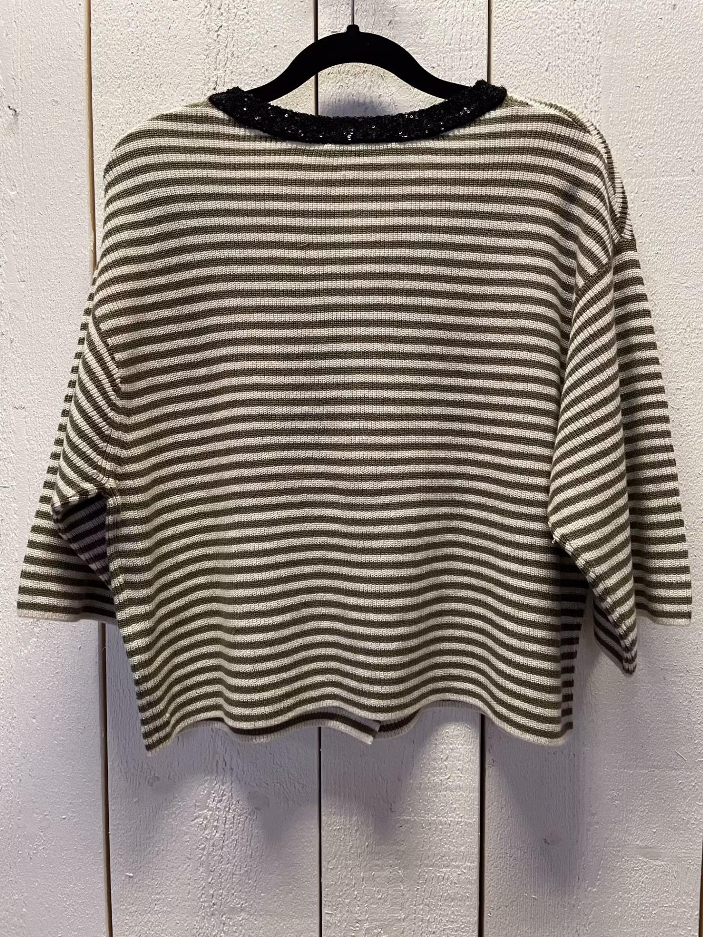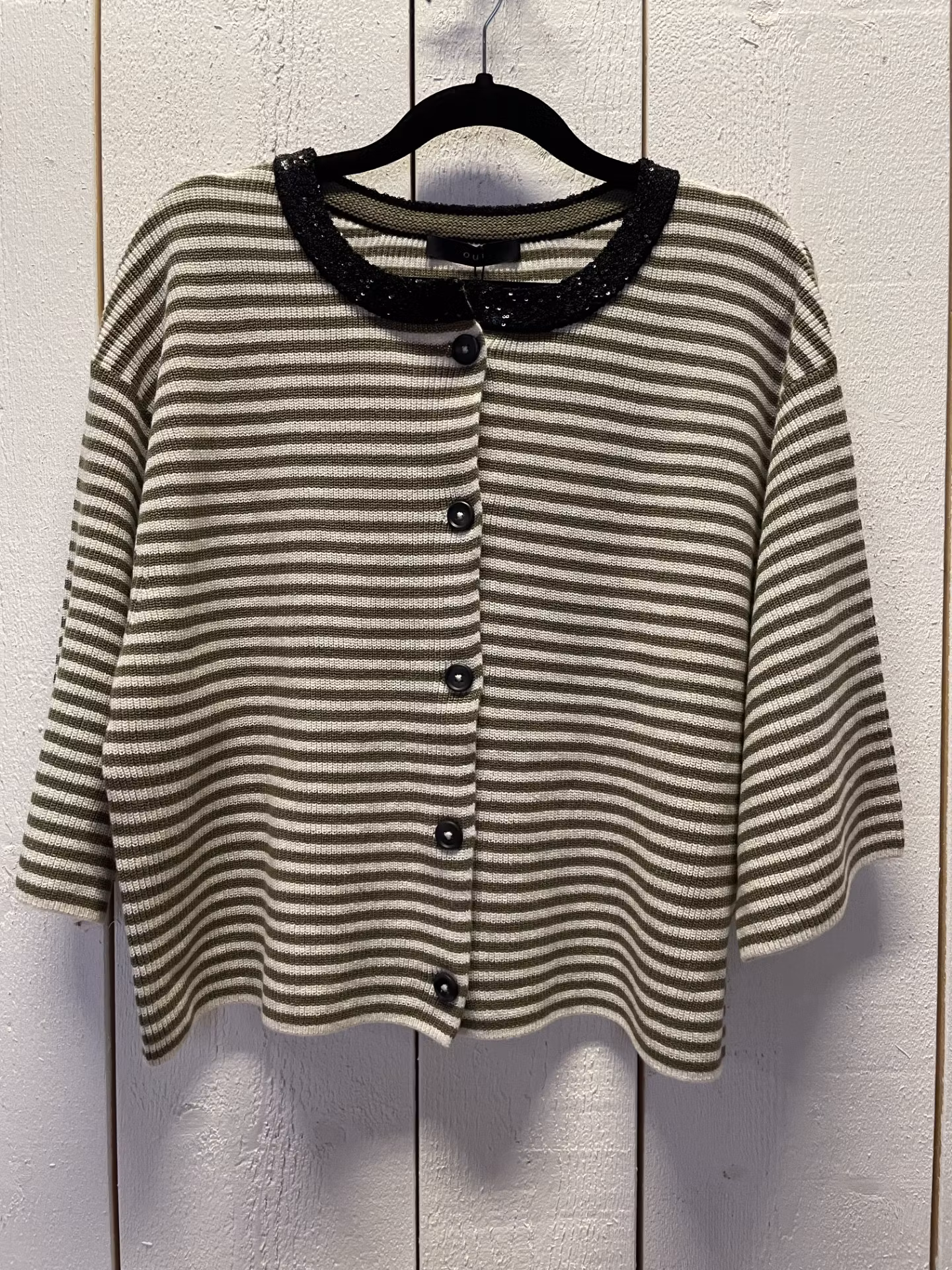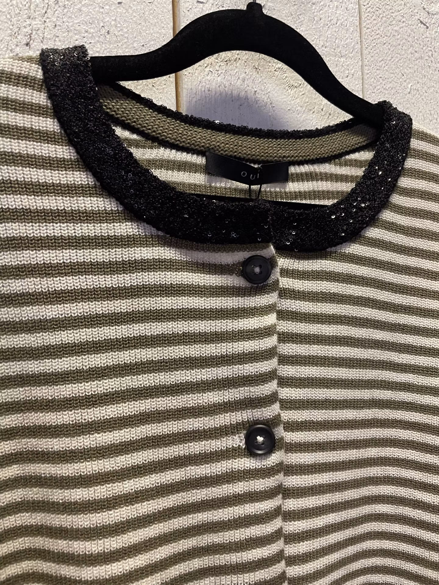I lager. OUI jacka / kofta " rand " , oliv 1 450 kr storlek 34 36 38 40 42 44 46 Lägg i varukorgen Rundhalsad Jacka / kofta med glitterpaljetter i halsringning. Knappar hela vägen och 3/4 ärm. Randig.Färg : Ecru / oliv med svart glitter Material : 96 % Bomull , 4 % Polyester Tvättråd : 30° tvättpåse