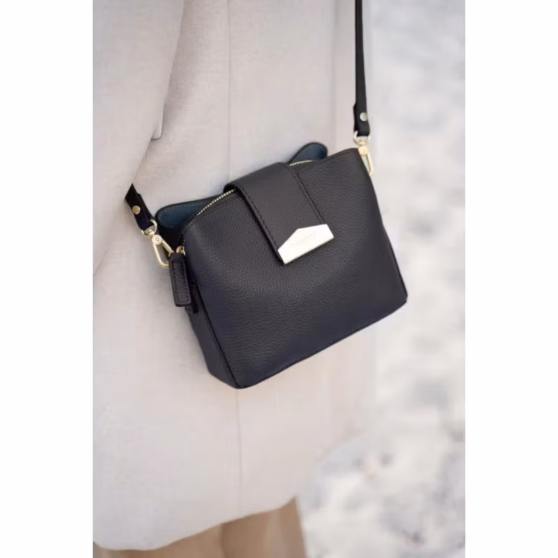 Cavalcade " Petit Trotteur " är en handväska som kombinerar elegans och funktion. Dess marinblå färg ger den ett sofistikerat utseende, perfekt för att komplettera en mängd olika klädstilar. Väskan har tre väldesignade fack : ett huvudfack som stängs med dragkedja, samt ett fram- och bakfack, som båda stängs med ett magnetsystem. Den avtagbara och justerbara axelremmen gör att du kan bära väskan hur du vill.