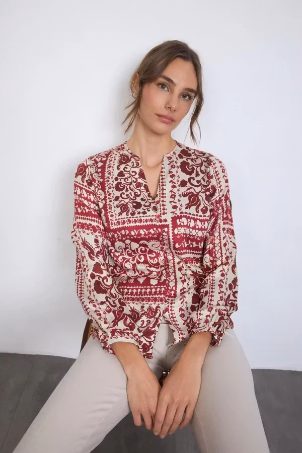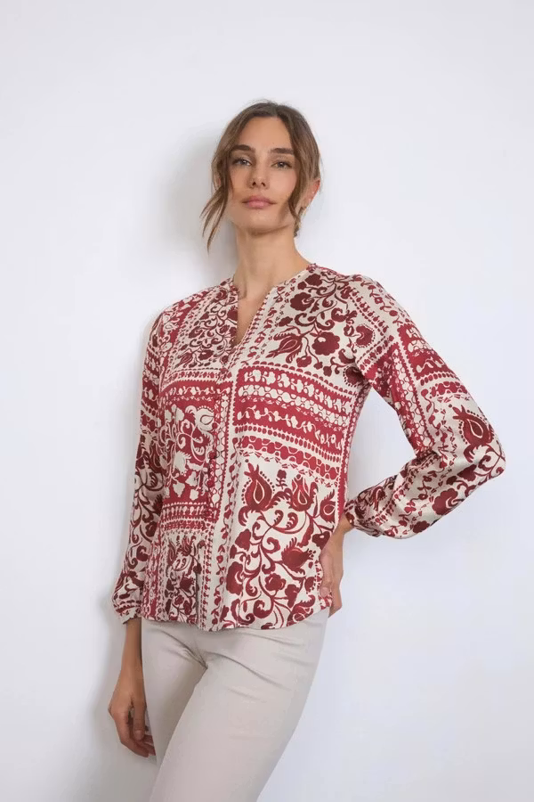 I lager. TINTA Blus "Eloisa" , vinröd 899 kr storlek 38 40 42 44 46 48 50 Lägg i varukorgen Långärmad , V-ringad blus med knappar hela vägen. Knapp vid ärmslut så den går att rulla upp. Färg : Vinröd , Beige Material : 100 % Viscose Tvättråd : 30°