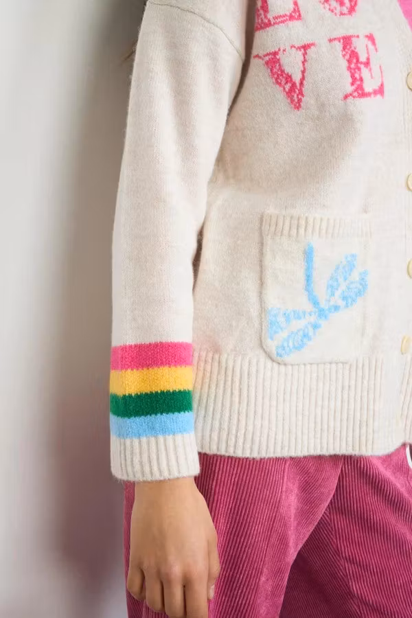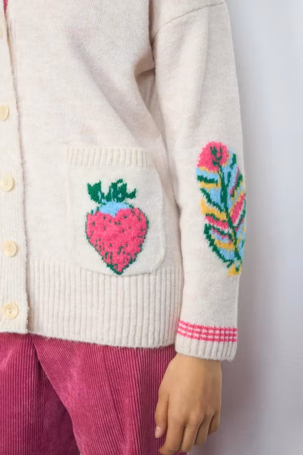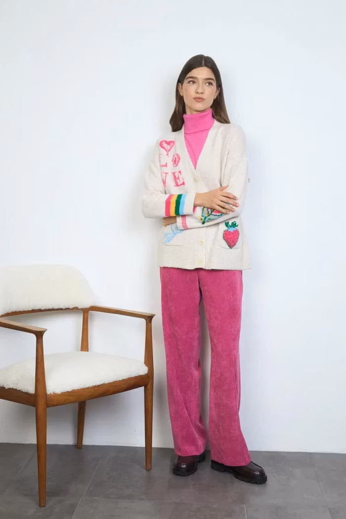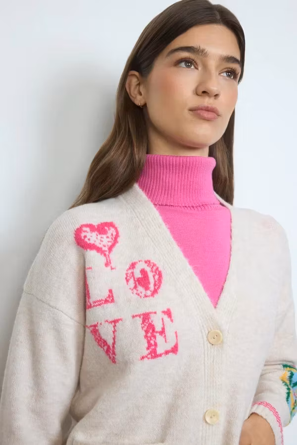 I lager. TINTA kofta "Pompeia ", off white 1 199 kr storlek S M L XL Lägg i varukorgen V-ringad kofta med 5 knappar. Fickor fram och mudd nertill samt i ärmslut. Roliga detaljer.Färg : Off White med rosa , turkost, grönt o gult. Material ; 60 % Polyakryl , 14 % Polyamid , 10 % Polyester , 8 % ull , 8 % ViskosTvättråd : Handtvätt