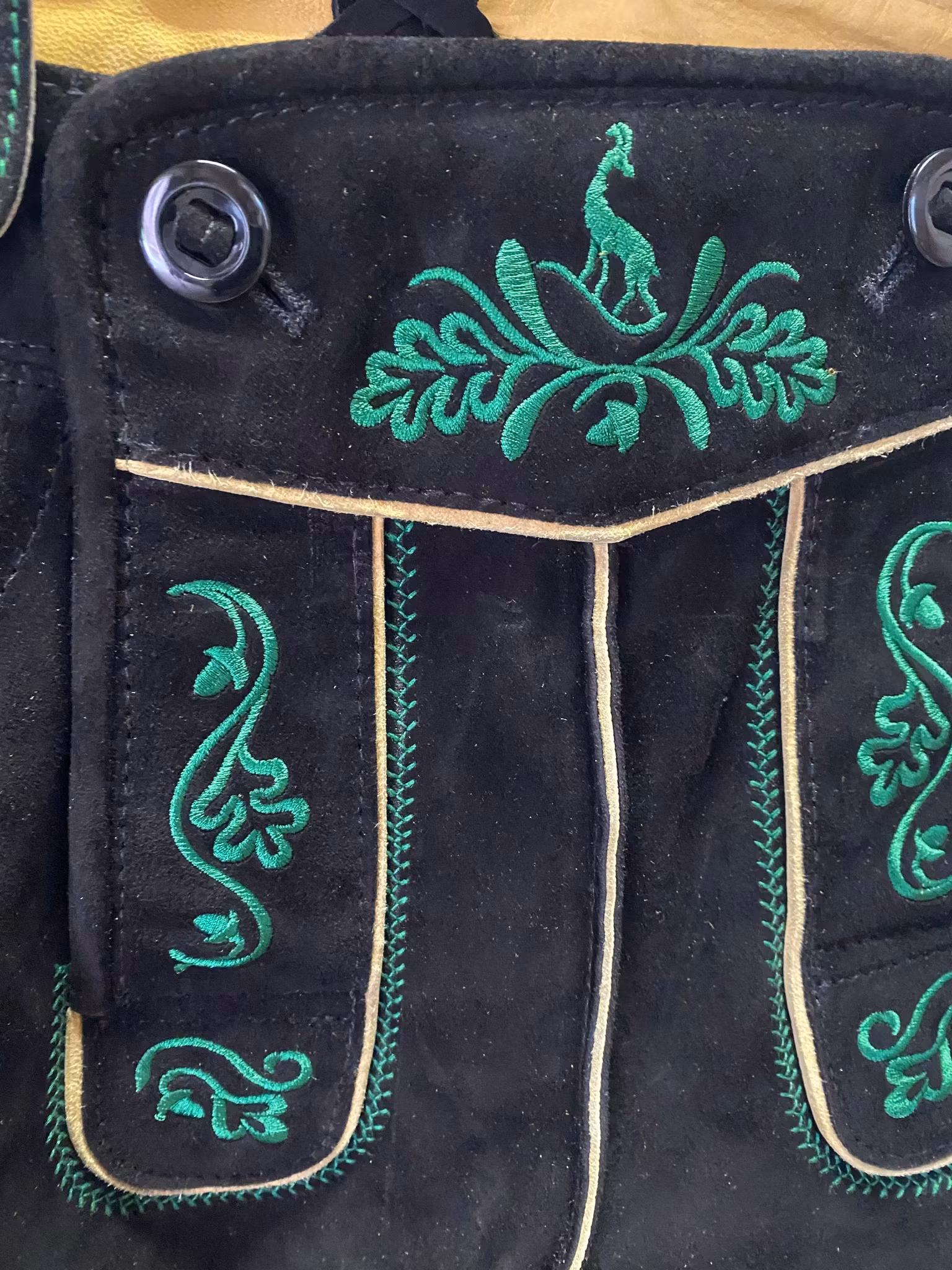 I lager. Schweigert's" Erlensee Wild" med hängsle, Schwartz 1 999 kr Storlek 56 Lägg i varukorgen Svarta lederhosen med gröna detaljer och med avtagbara hängslen. Finns även knapp i midan. Färg: Svart med gröna detaljerMått midja : 97 cm Lår : 59 cm ( mätt ovanför snörning ) Material: Skinn