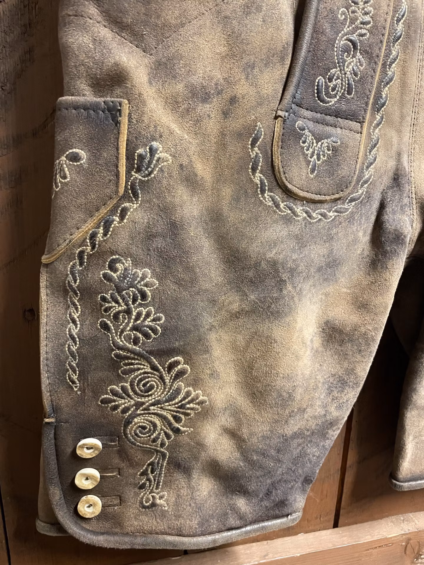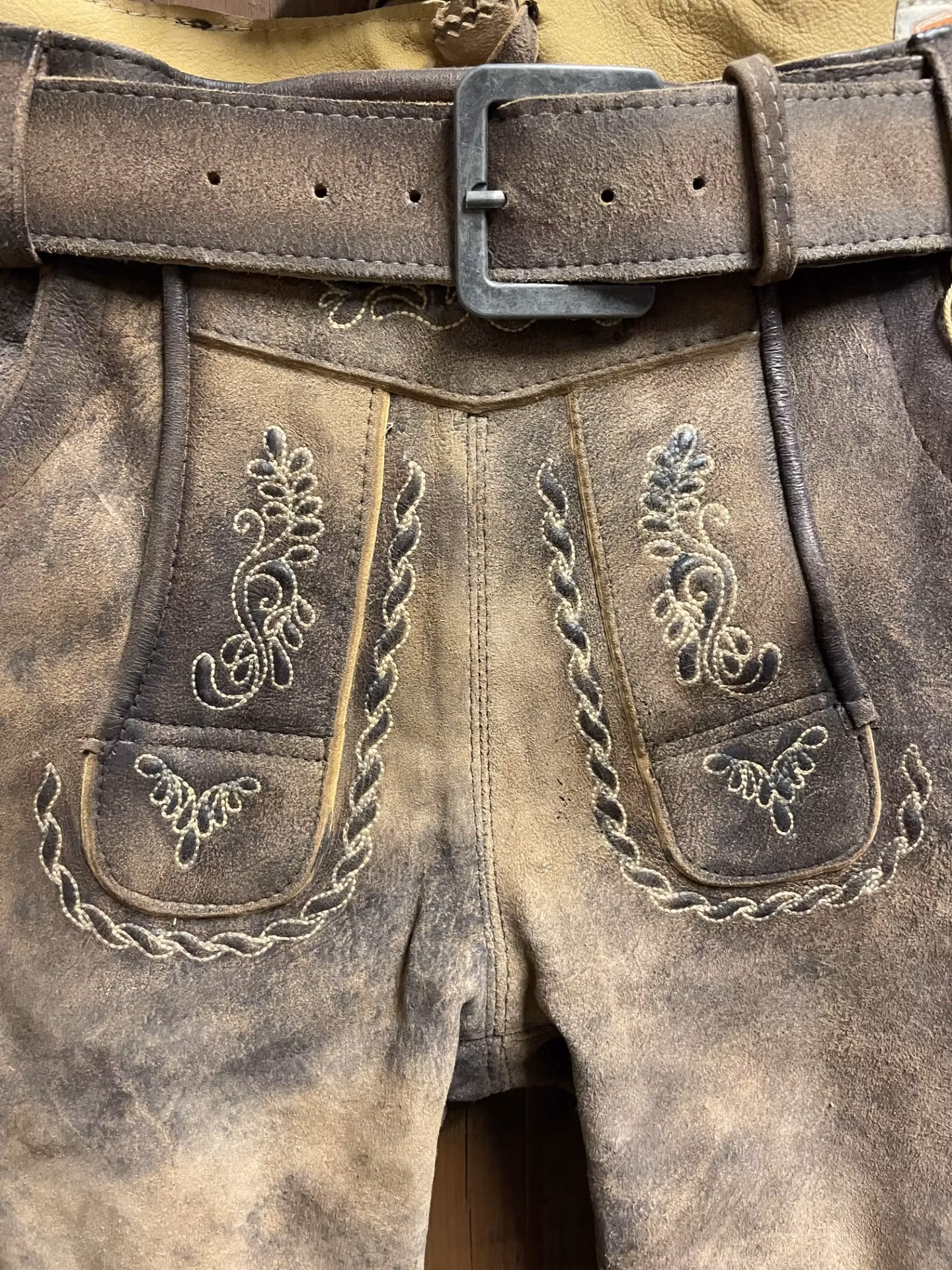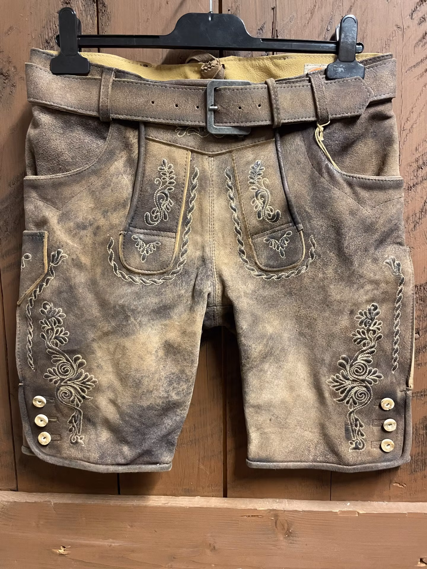 I lager. Maddox "Langsee Kies" med bälte, antik W 1 899 kr storlek 48 Lägg i varukorgen Härlig mjuk mocca lederhosen med ljusa broderier och benknappar. Det finns två fickor fram , en liten på höger sida ben samt en bakficka på höger sida. Färg : Antik W Mått : 84 cm Ben : 52 cm Material : Skinn