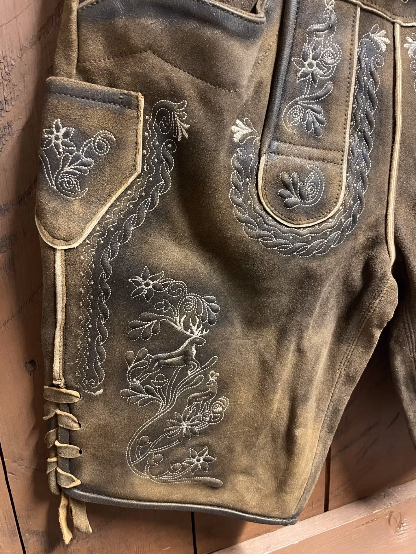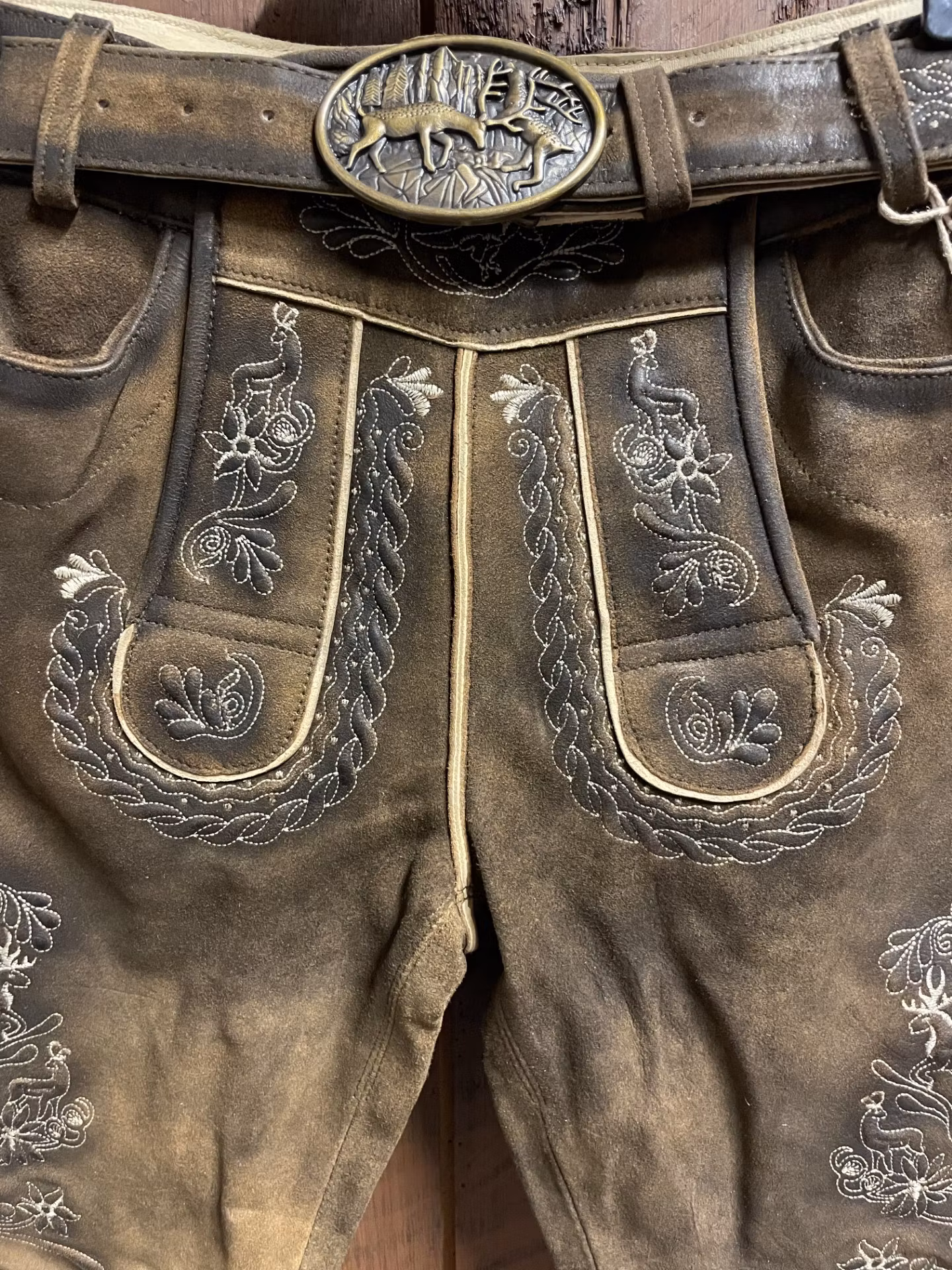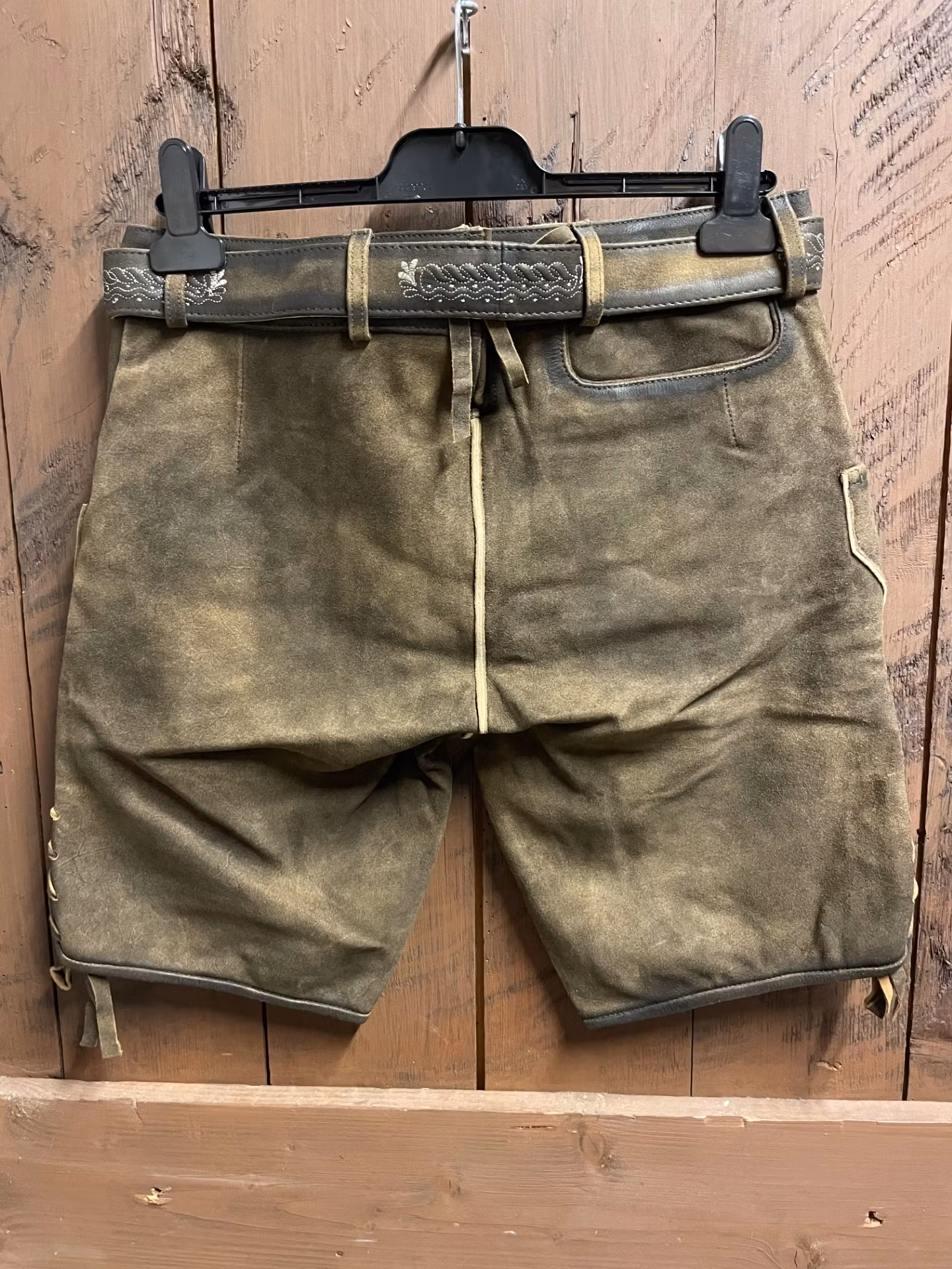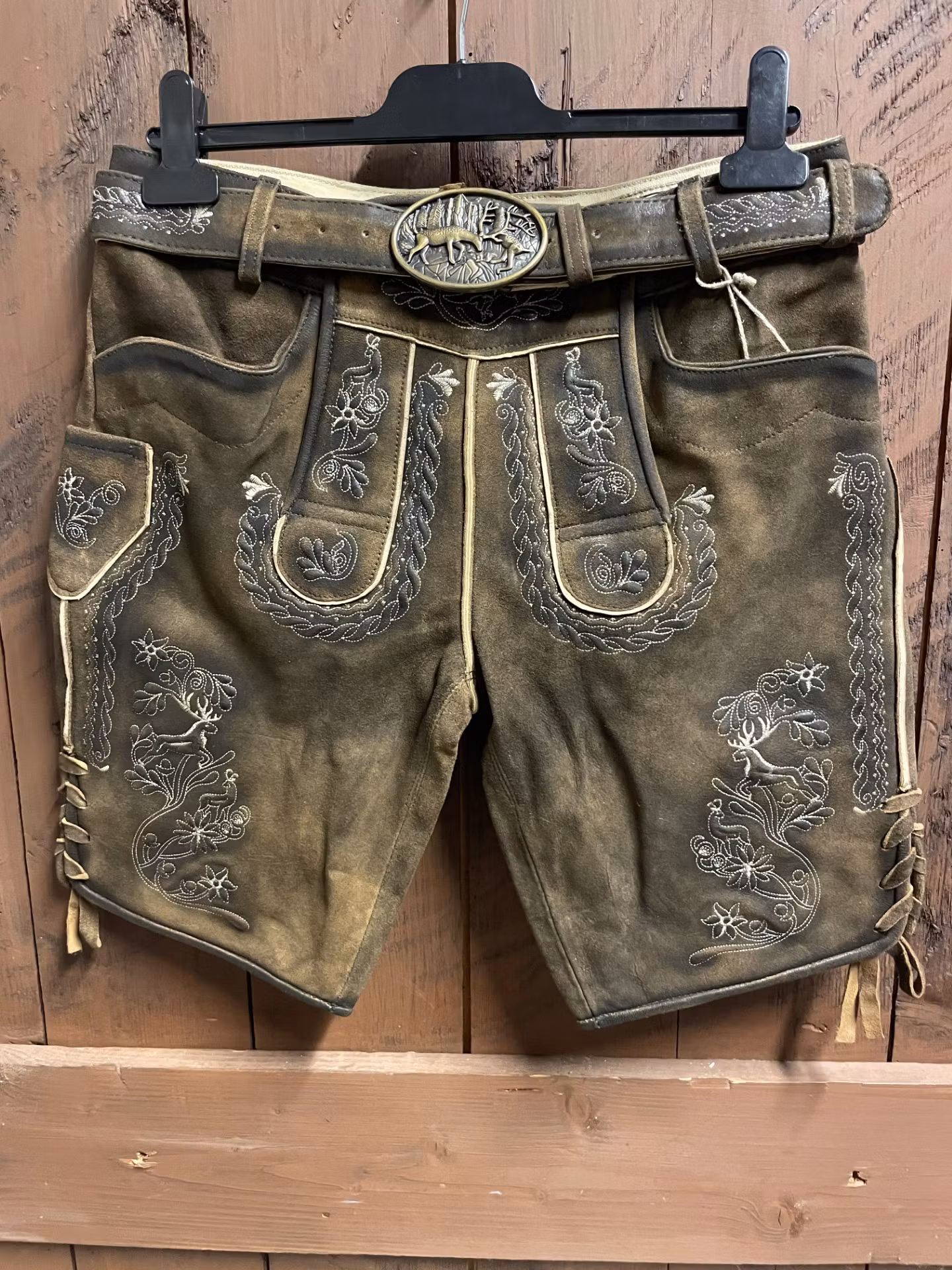 I lager. Trachten Rebell "Alex Wildbock " med bälte , Zirbe 1 899 kr storlek 48 Lägg i varukorgen Lederhosen med bälte och fina broderier både på shortsen OCH på bältet. . Lucka och två fickor fram ,snörning i benet och en liten ficka på höger ben samt en bak hö. Färg : ZirbeMidja : 82 cm Lår : 54 cm Material : 100 % Skinn