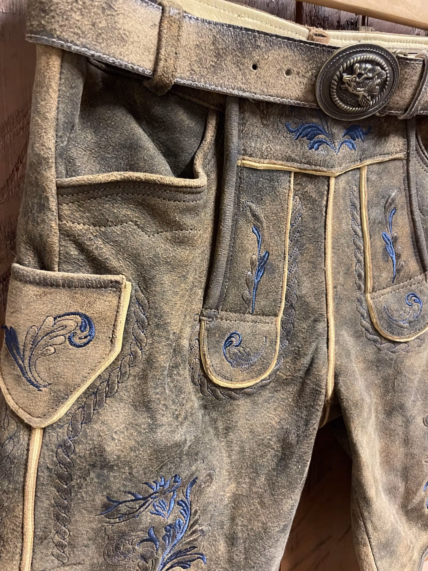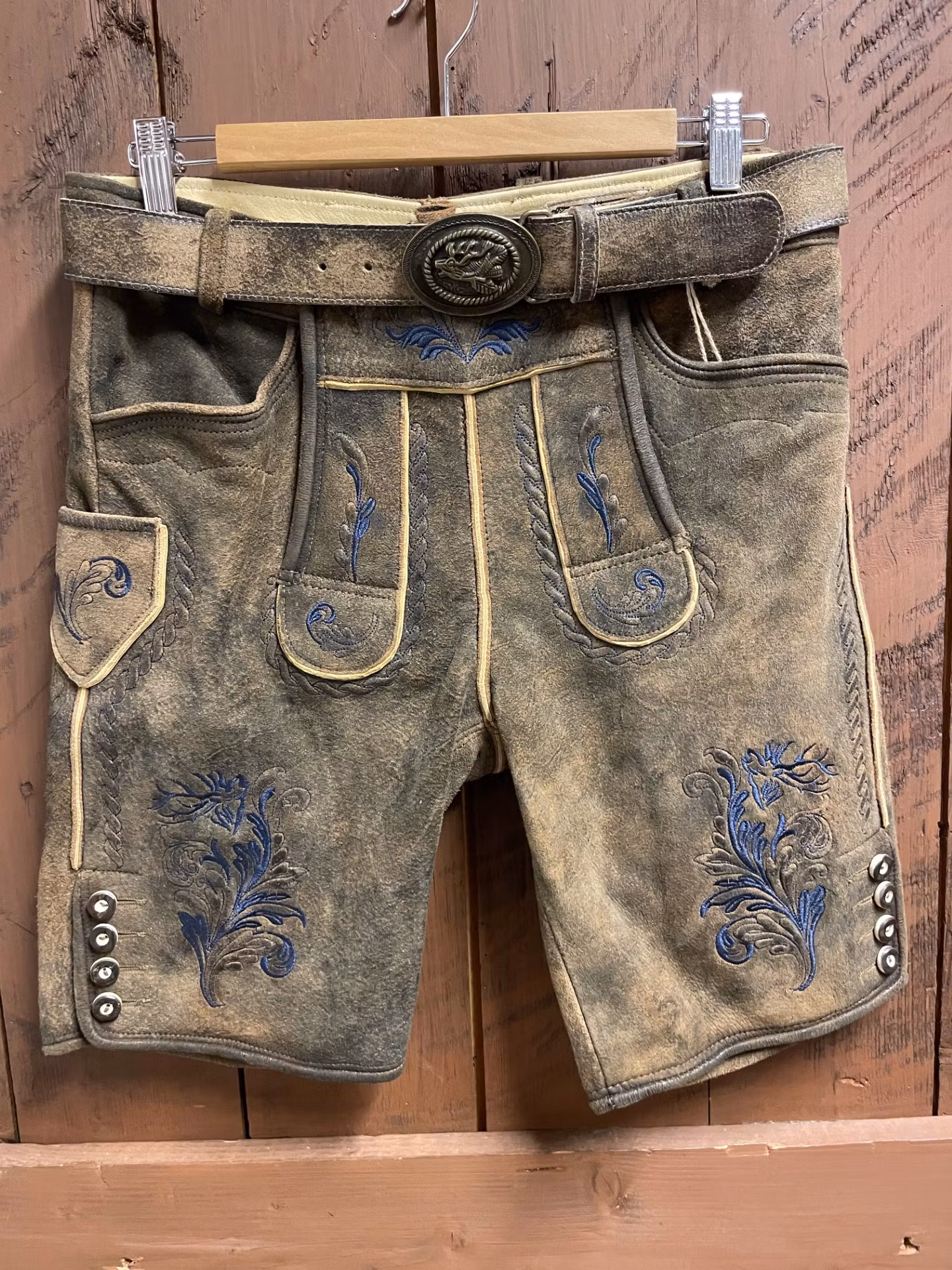 I lager. Trachten Rebell "Kilian rustik " med bälte , Fichte Blau 2 199 kr storlek 48 Lägg i varukorgen Lederhosen med bälte och fina blå broderier. Lucka och två fickor fram , " benknappar " i benet och en liten ficka på höger ben samt en bak hö. Färg : ZirbeMidja : 84 cm Lår : 54 cm Material : 100 % Skinn