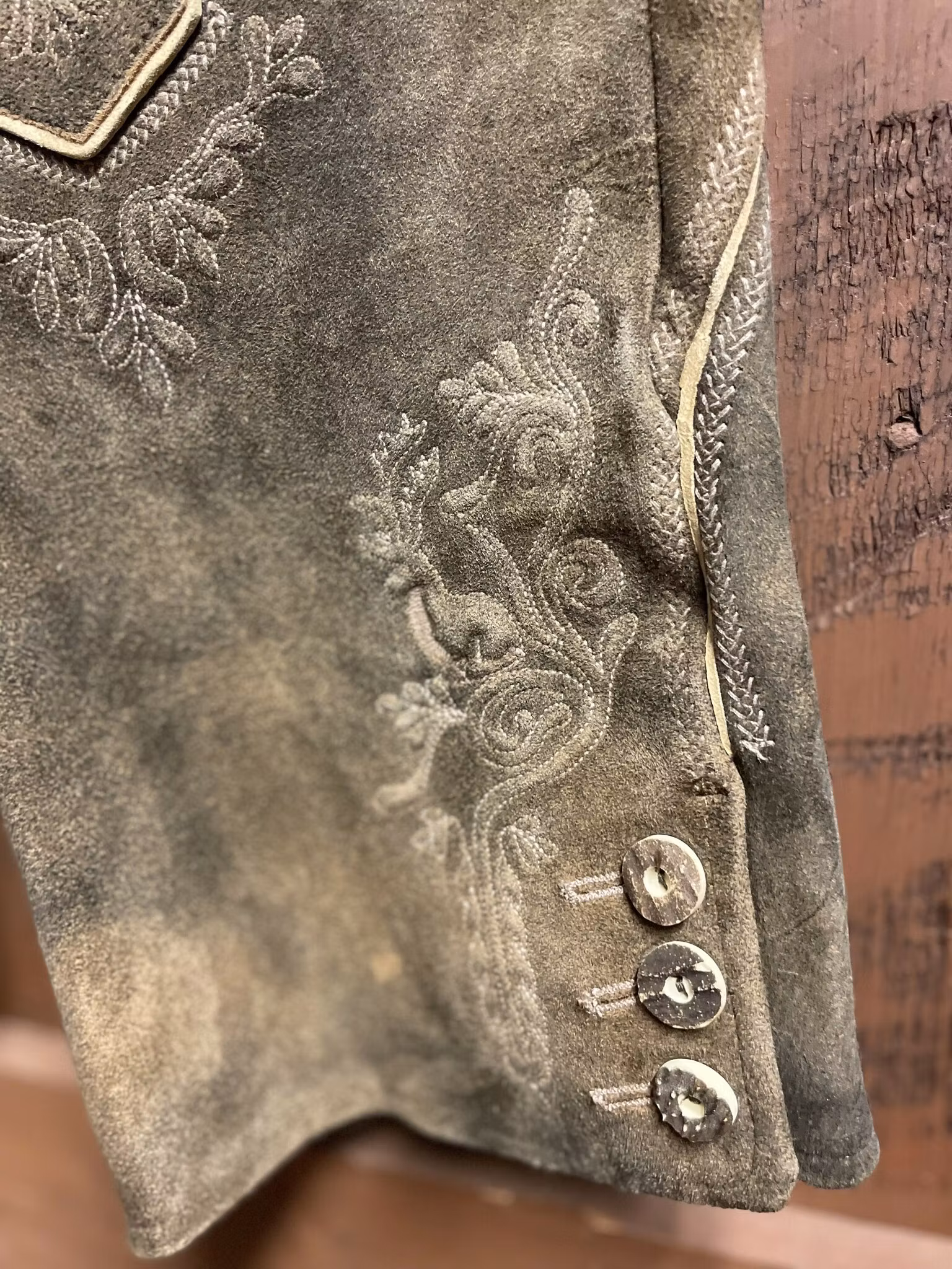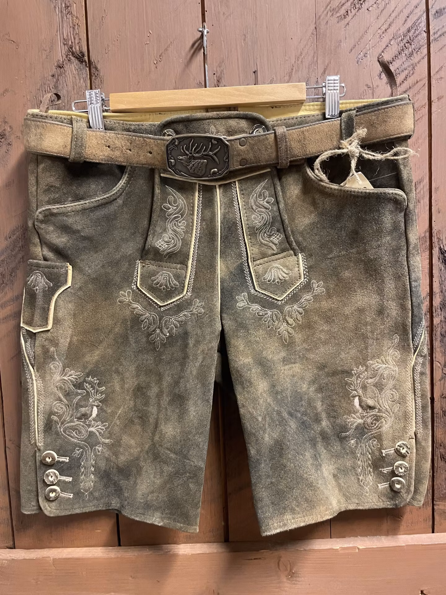 I lager. Maddox "Nockerberg Wild"med bälte , Korn 2 199 kr storlek 54 Lägg i varukorgen Mjukt mocka skinn i gråbrun ton med ljusa , fina broderier. Två fickor fram och en bak på höger sida. Knivficka och benknappar i sidan samt broderad detalj på sätet. Färg : Korn Mått : Midja : 97 cm , Lår: 57 cm Material : Skinn