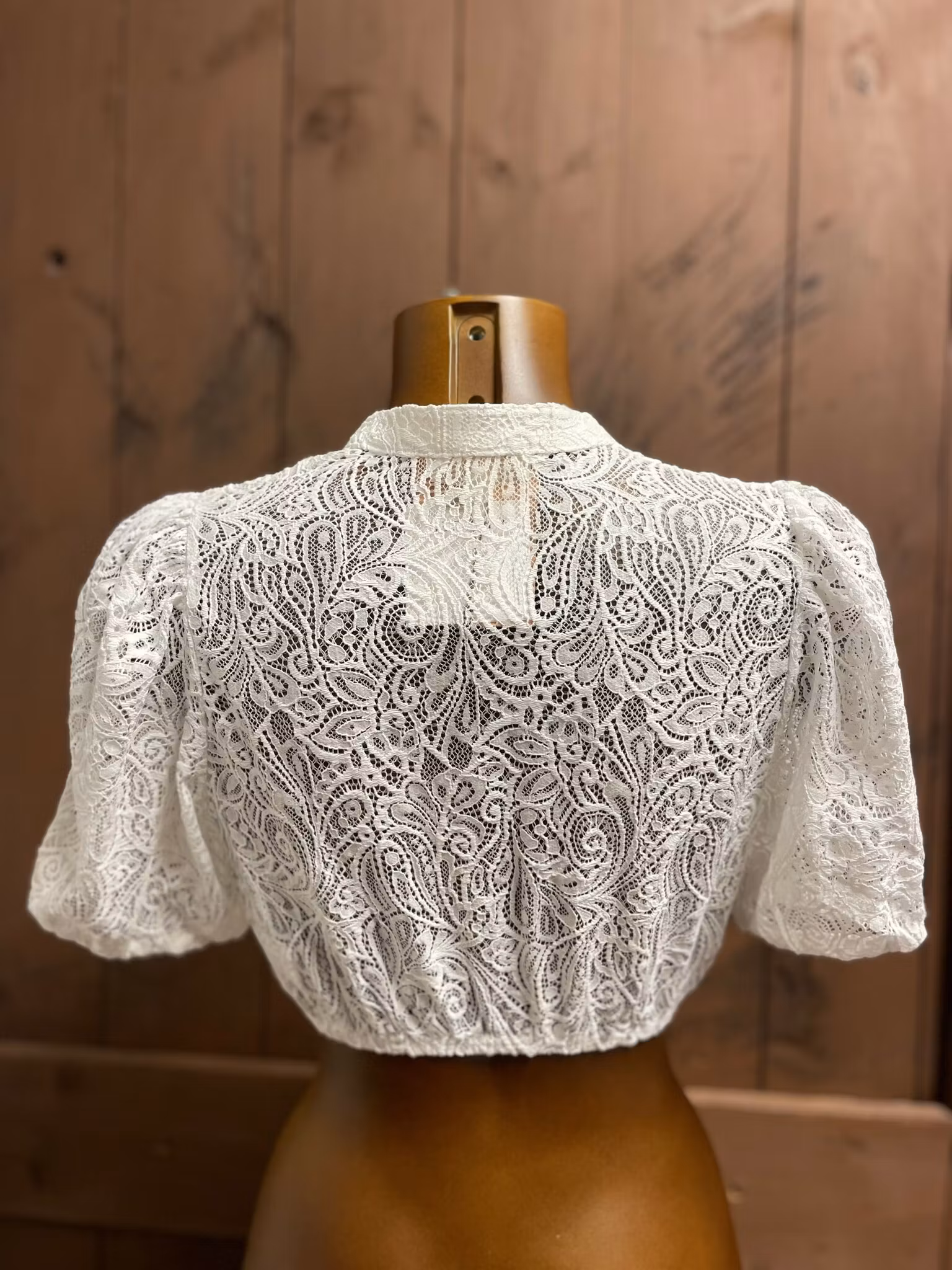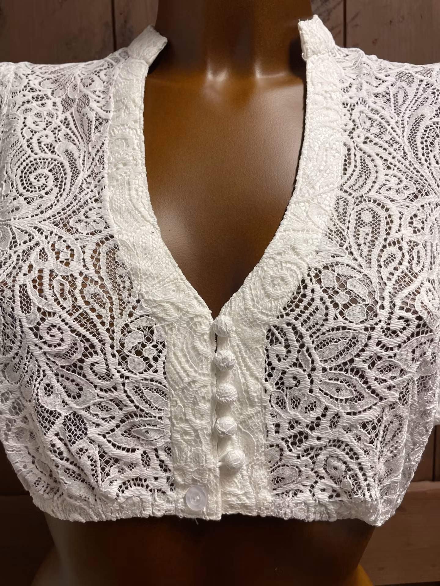 I lager. Krüger " V-ring" Spets Dirndl blus , ecru 850 kr storlek 38 40 42 44 46 Lägg i varukorgen Dekorativ spetsblus med annorlunda och fint dekolletage. 3/4 ärm med fint avslut i spetsen. Färg : EcruMaterial : 85 % Polyamid , 15 % Bomull Tvättråd : 30°