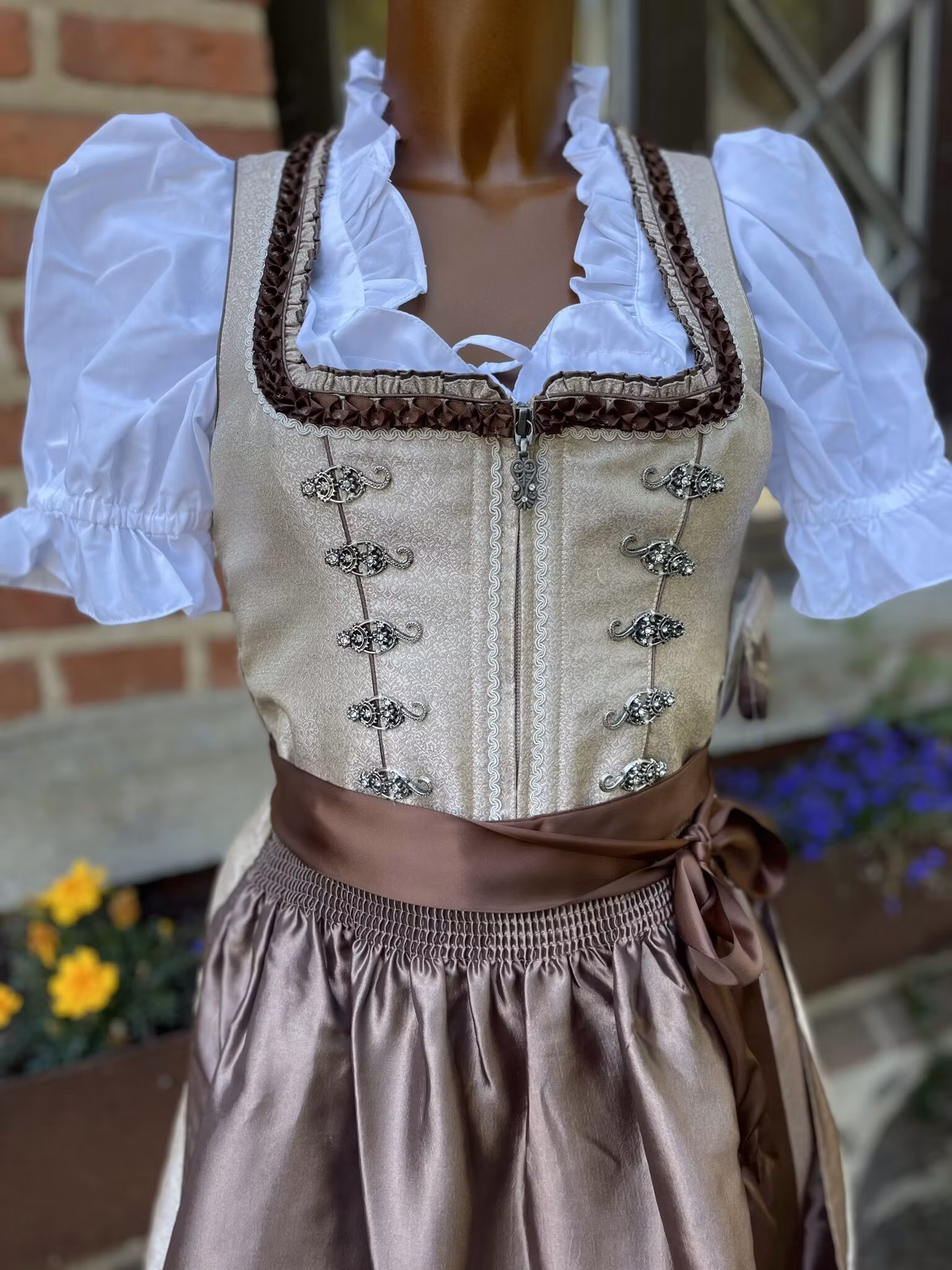 Lyxig dirndlklänning i fin taupe färg med brunt förkläde och sidenbands rosett. Fina detaljer på livet med mörkbrunt sidenband ( medföljer ) som kan knytas i öglorna med bling . Två fickor fram med dragkedja. Längd på kjol i stl 36 : 58 cm