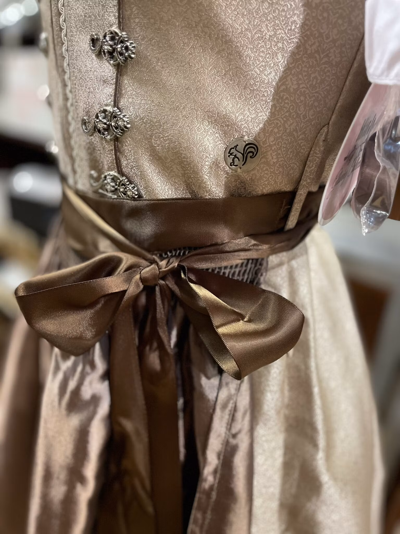 Lyxig dirndlklänning i fin taupe färg med brunt förkläde och sidenbands rosett. Fina detaljer på livet med mörkbrunt sidenband ( medföljer ) som kan knytas i öglorna med bling . Två fickor fram med dragkedja. Längd på kjol i stl 36 : 58 cm