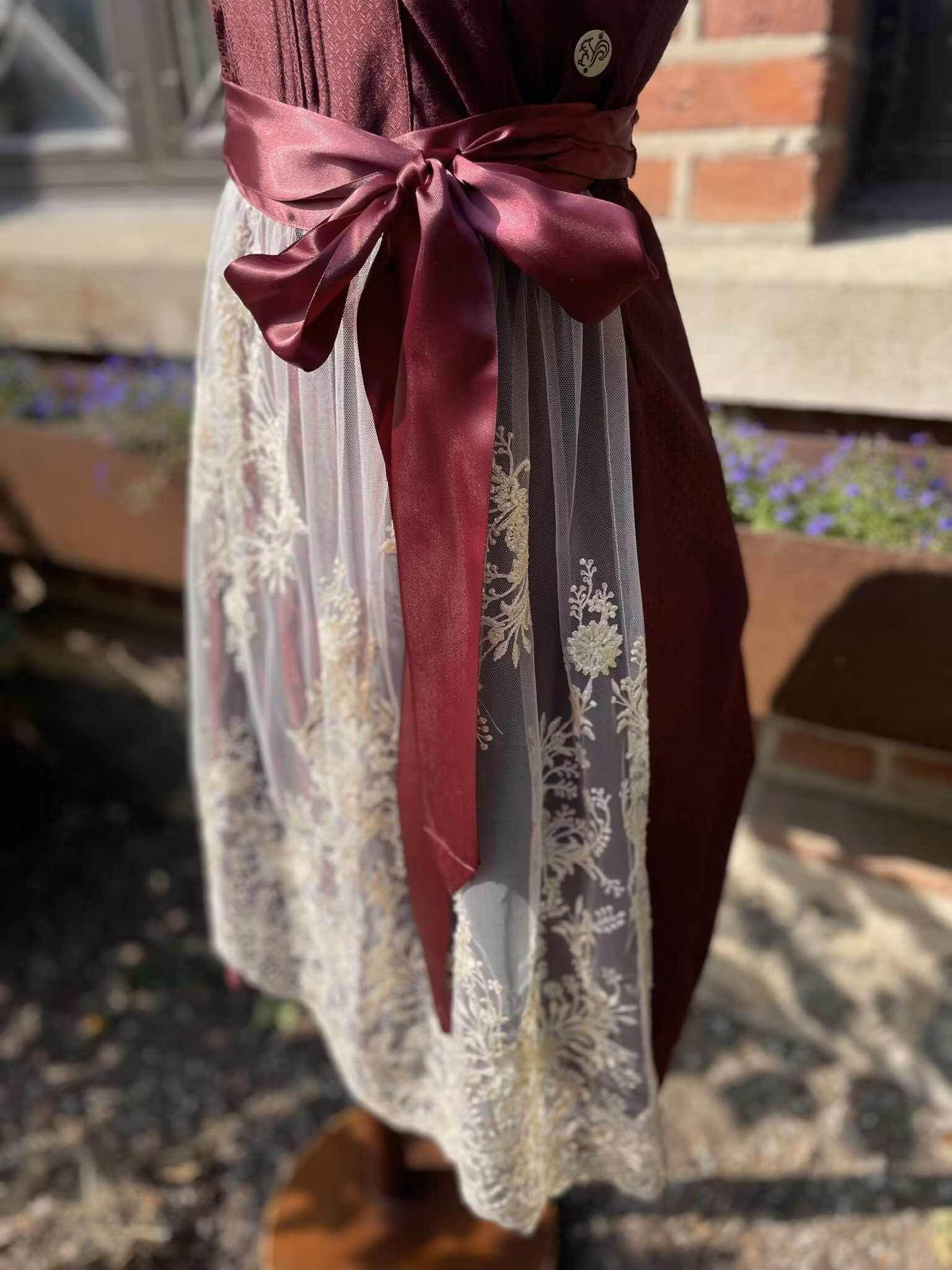 En "Krüger" inspirerad klänning i finaste vinröda färgen med cremefärgat spetsförkläde och glitterstenar. Så otroligt festlig o fin Dirndlklänning ! Fickor i sidorna och dragkedja i livet. Brett vinrött sidenband. Längd på kjolen i stl 36 : 65 cm