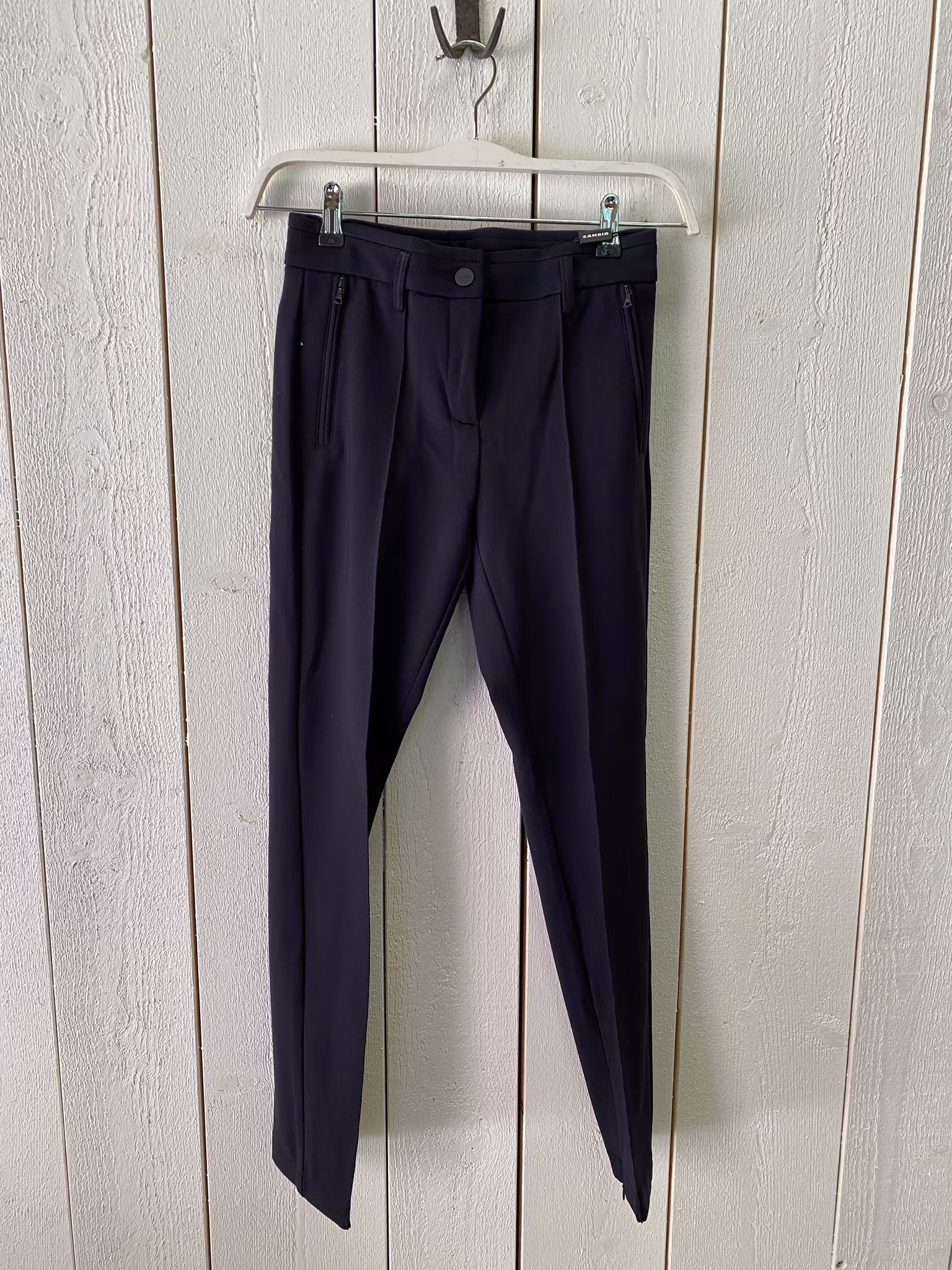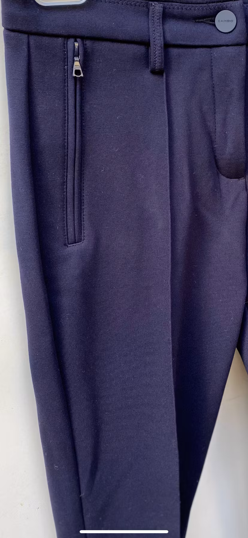 I lager. Cambio "Rhona" Marin 2 199 kr Storlek 34 36 38 40 42 44 46 Lägg i varukorgen Mörkblå byxa Cambio. Den har fickor i sidorna. Dragkedja längst ner i byxben. Byxan är i underbar stretchkvalite.Knapp i midjan. Avsmalnande ben i modellen.Färg: MarinblåMaterial: 63% Viscose 32% Polyamid 5% ElastanTvättråd: Handtvätt