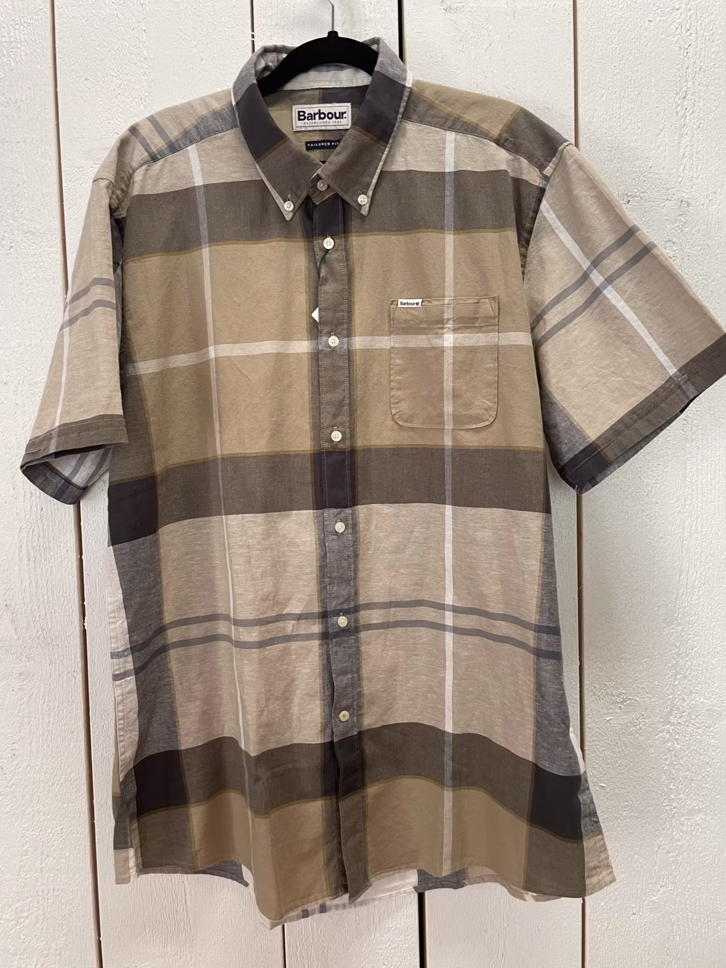 I lager. Barbour skjorta "Douglas Tailored Shirt " , kortärmad 999 kr Storlek M L XL XXL Lägg i varukorgen Klassisk kortärmad skjorta i sobra färger och kort ärm. Färg : Beige, grå & creme Material : 79 % Bomull , 21 % LinneTvättråd : 30°