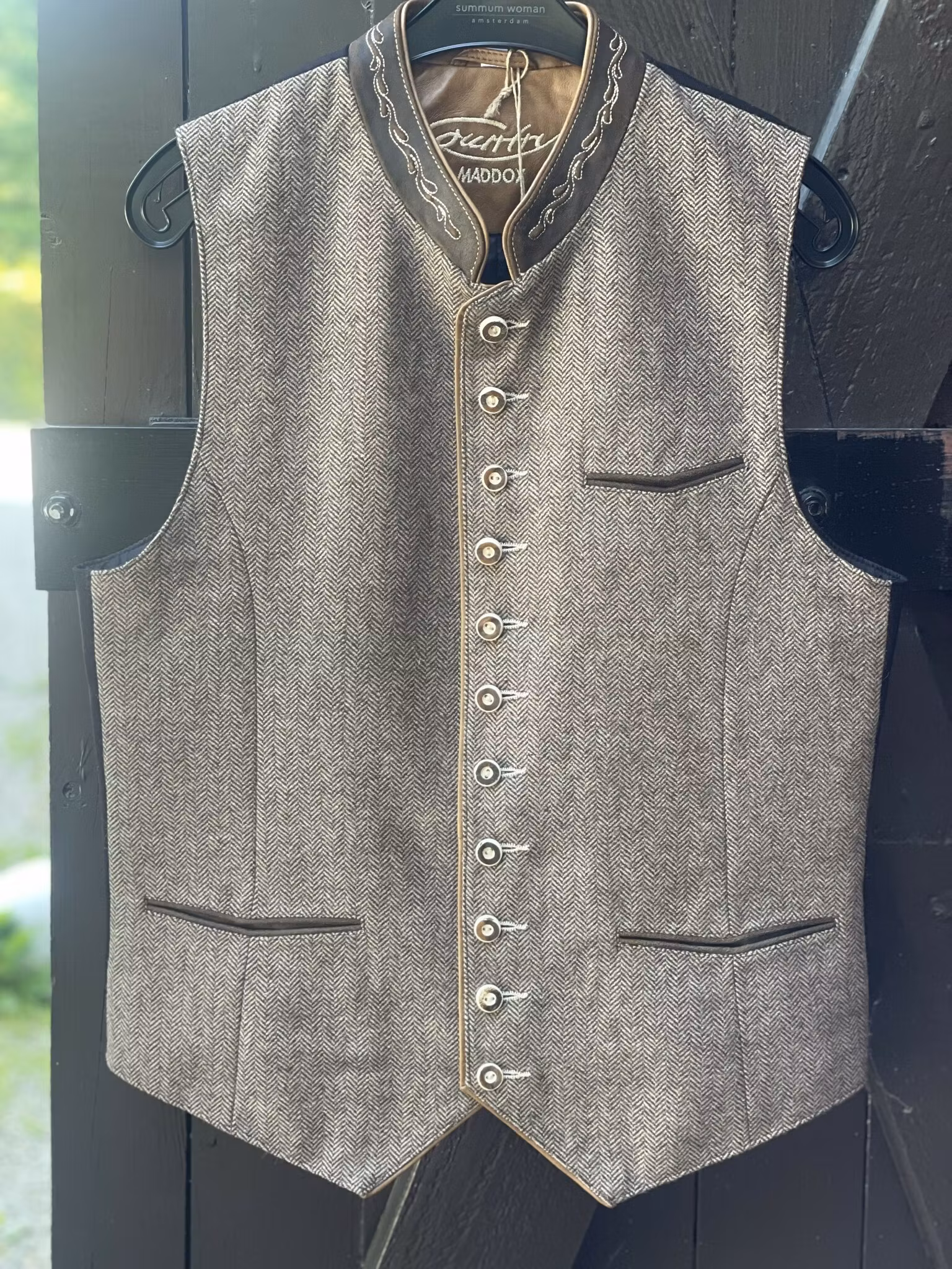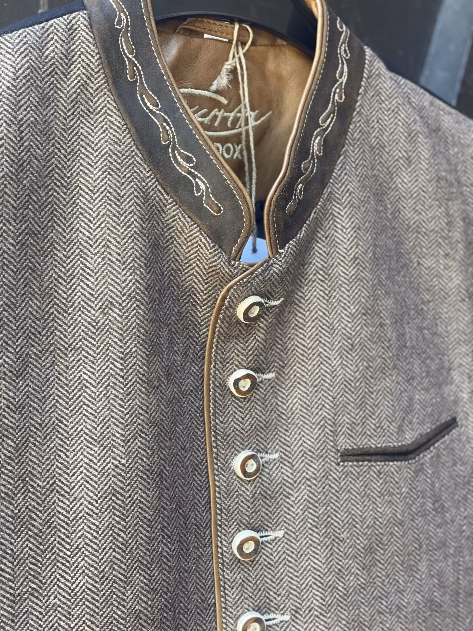 Otroligt fin väst i fiskbensmönstrat ull med snygga detaljer.